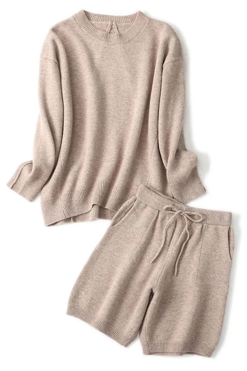 100% wool suit women's round neck loose loose pullover lazy sweater full sleeve knitted cashmere shortssuit High-end comfort
